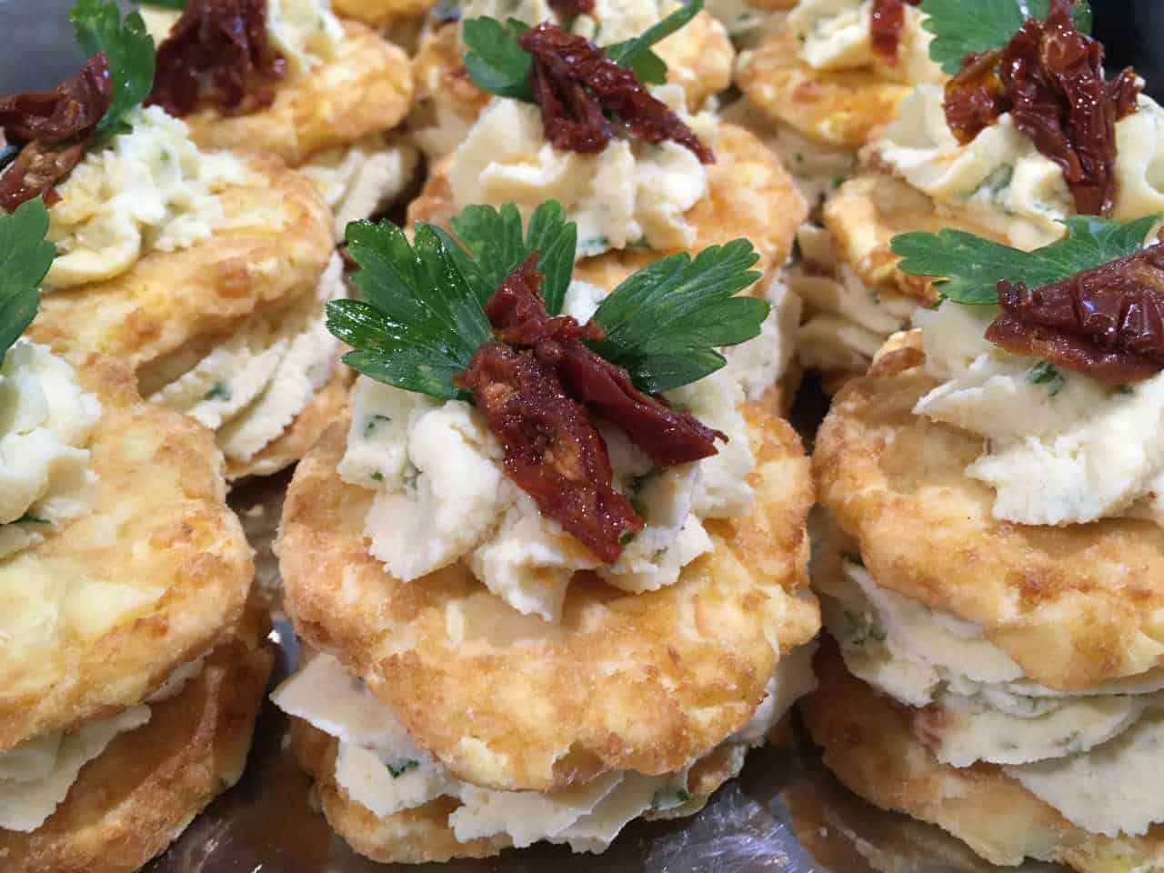 Pommes Duchess på röstibund af Fløderørt kartoffelmos, persille og soltørret tomat.