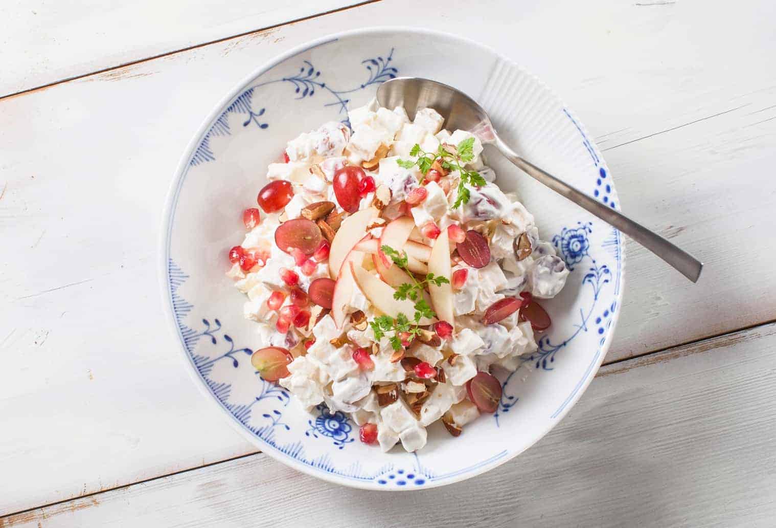 Klassisk Waldorfsalat. Vindruer, æble, bladselleri og valnødder i cremet flødedressing.