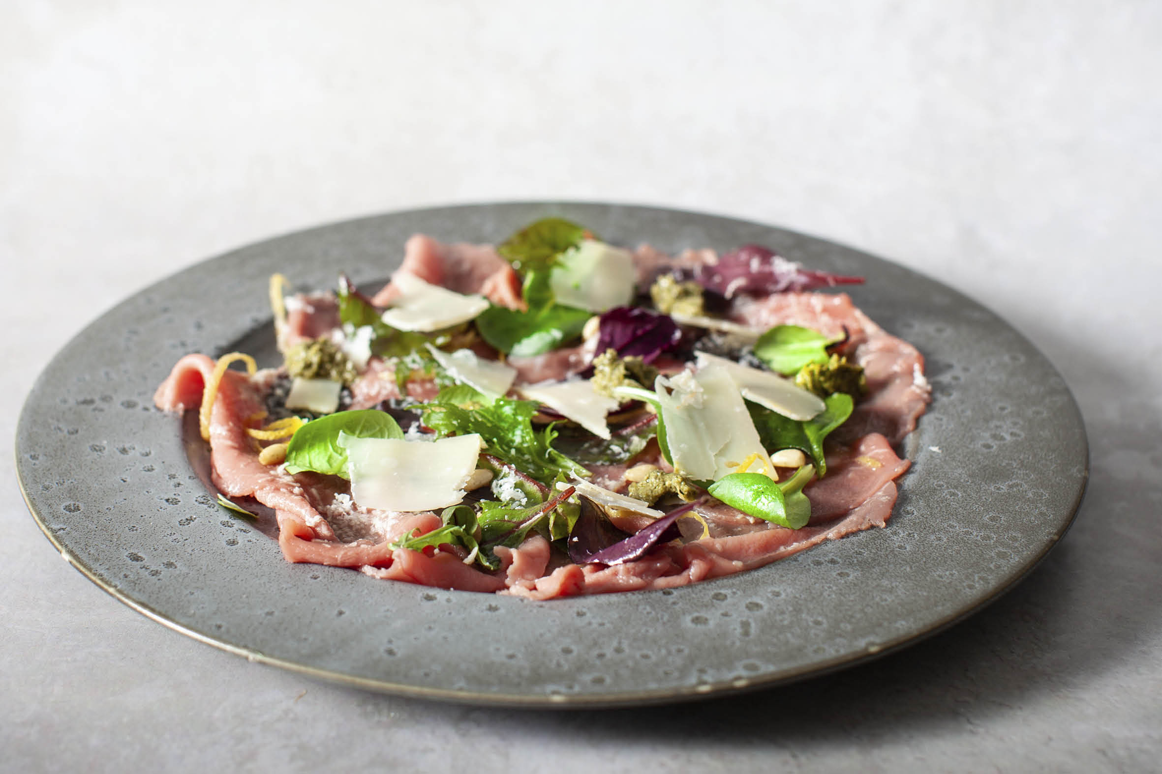 Super mør og lækket Carpaccio af oksefilet i tynde skiver.