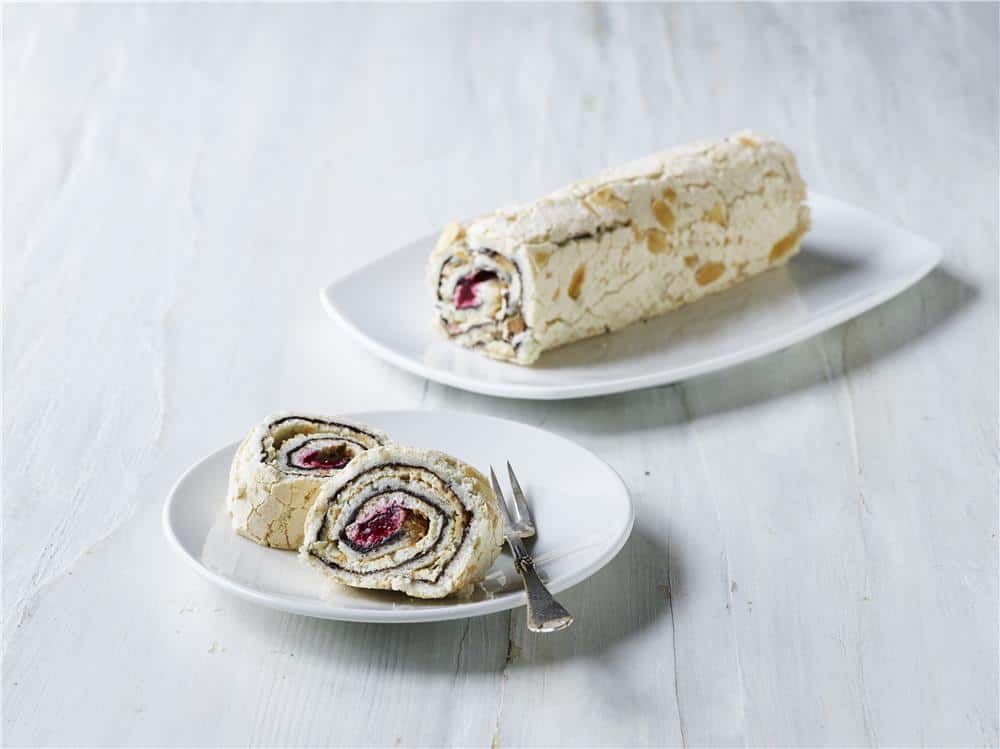 Fragilite roulade af blød marengs rullet med mørk chokolade og hindbær.