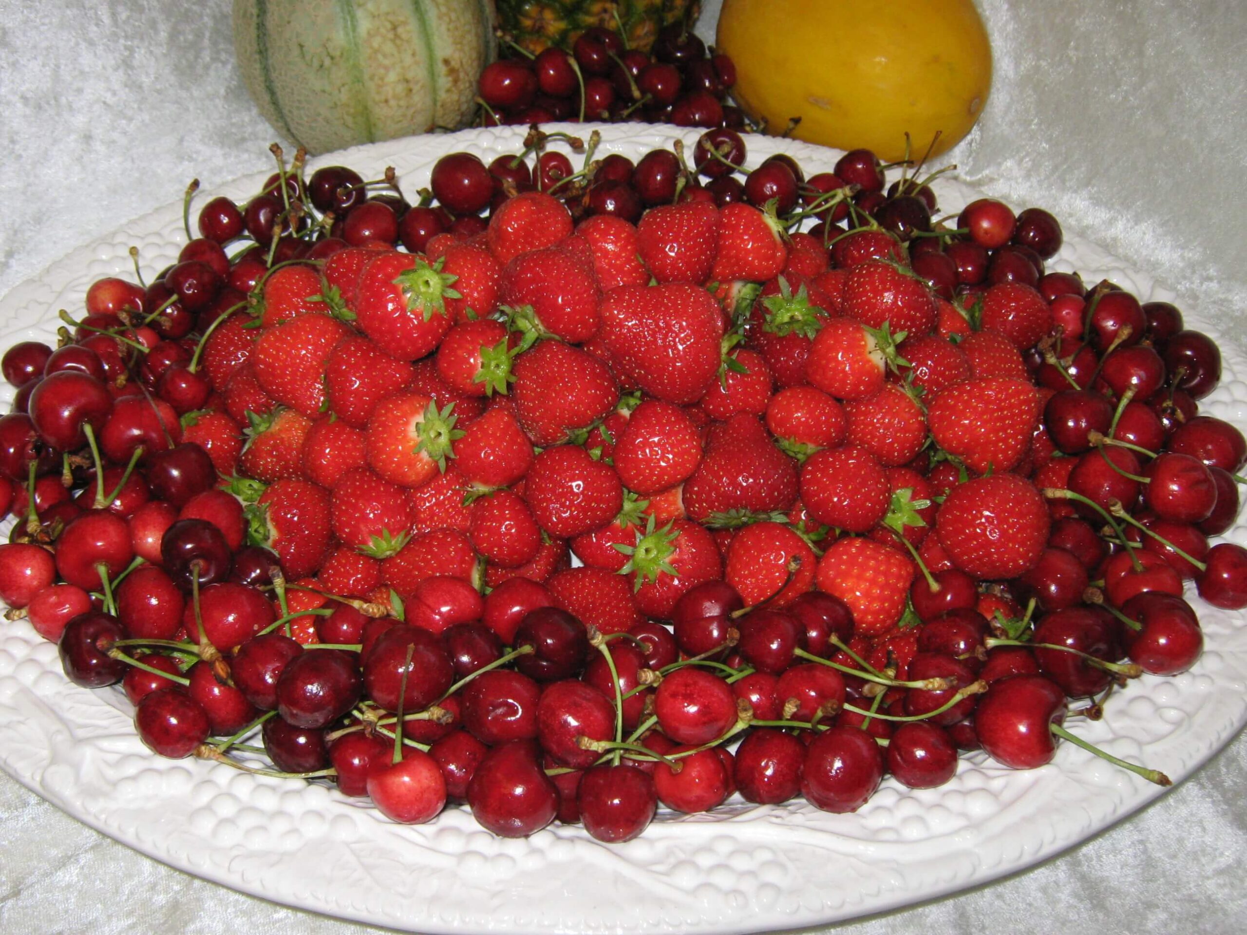 Årstidens friske frugter og bær skåret i mundrette stykker.