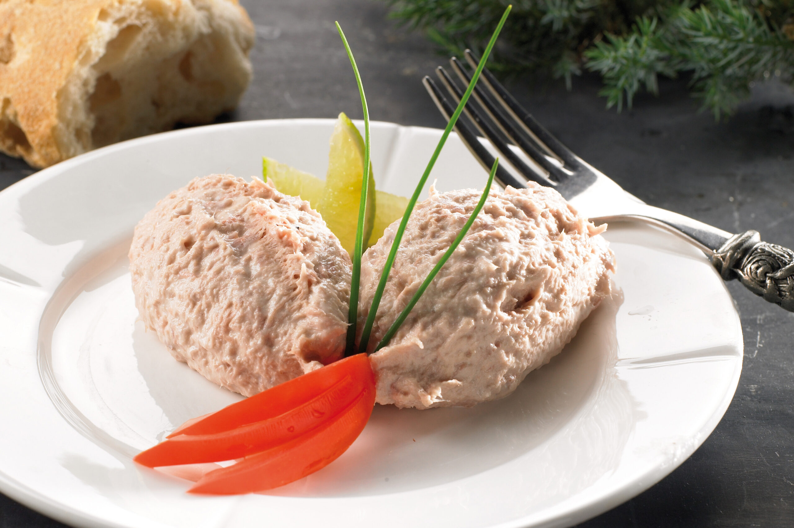 Fadanrettet hjemmelavet tunmousse med kaviar, friske rejer, citronbåde og frisk dild.